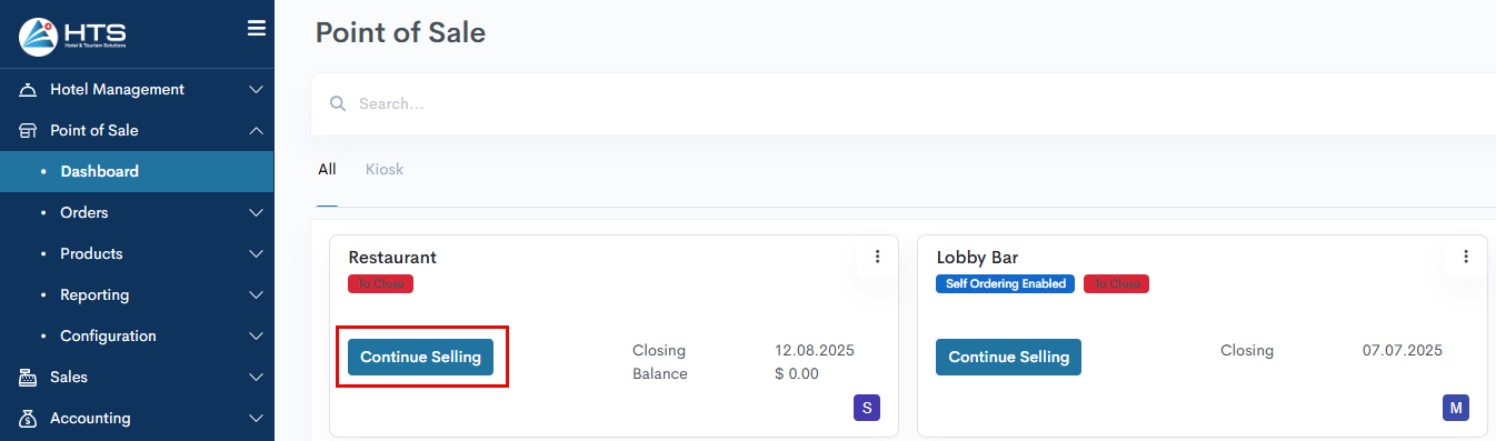 Nachdem alle notwendigen Einstellungen abgeschlossen sind, wählen Sie entweder eine neue PoS-Sitzung zu starten oder den Verkauf in der bestehenden fortzusetzen: